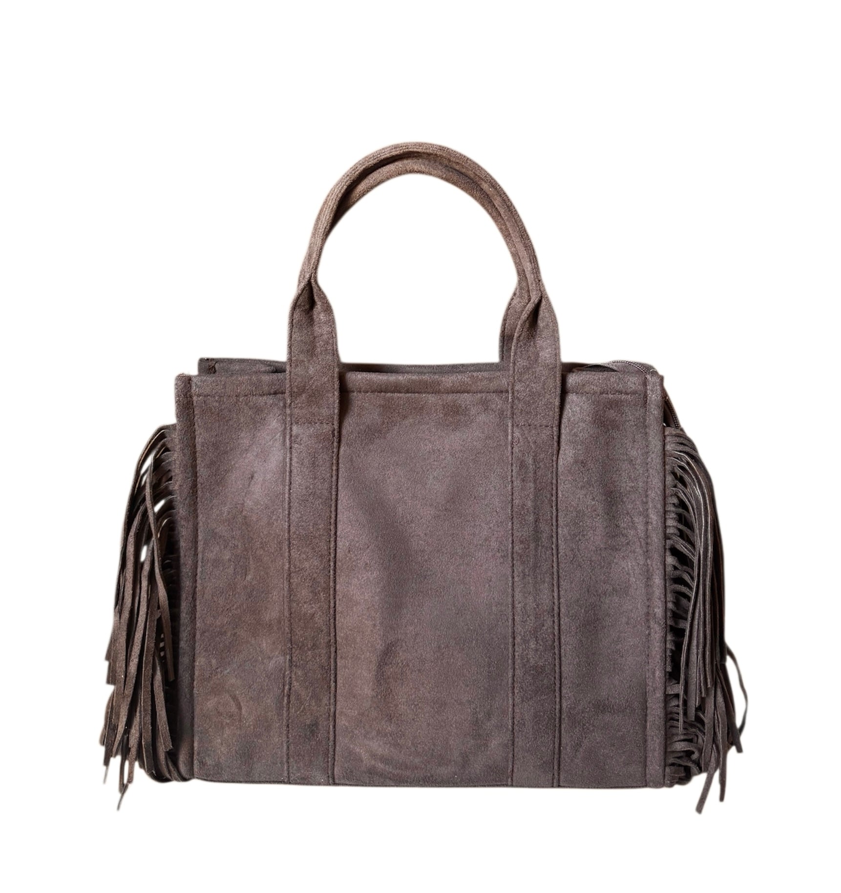 Tote bag scamosciata con frangie laterali, con tracolla regolabile all'interno, manico comodo da mettere anche a spalla.