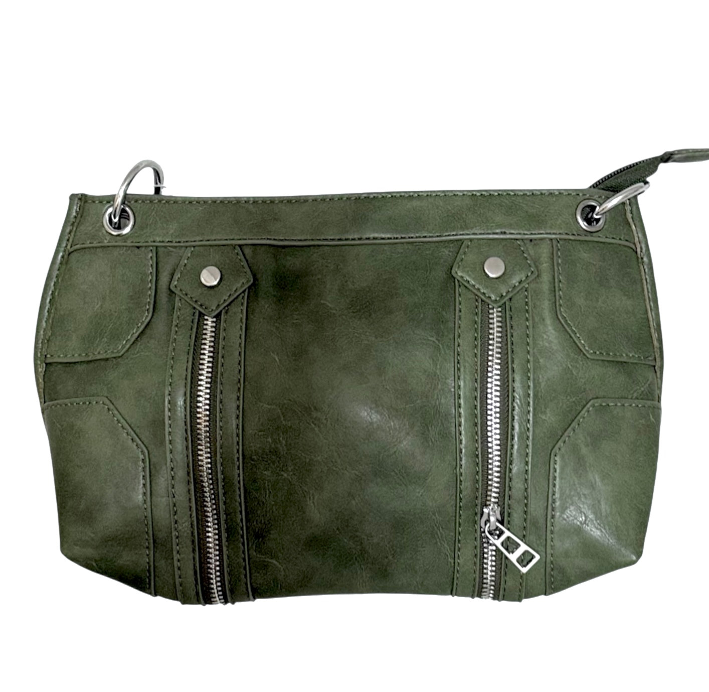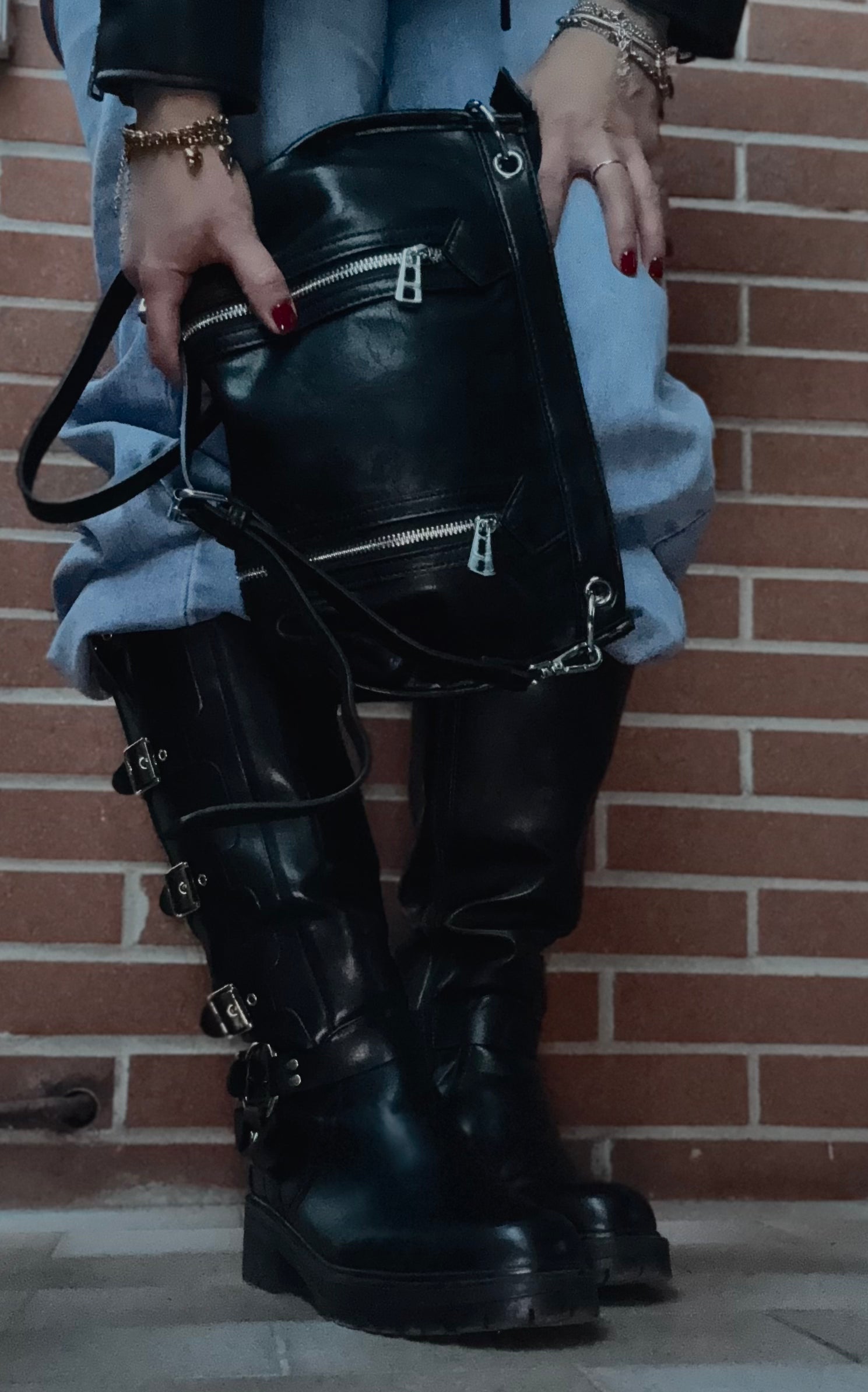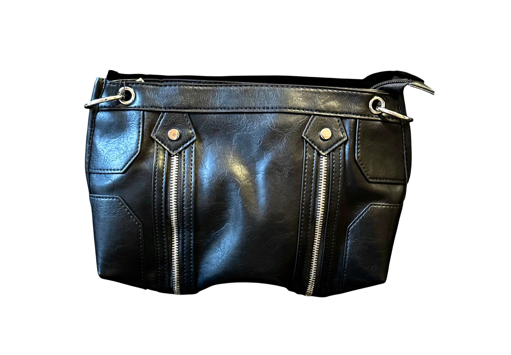 Dotata di chiusura a zip e tracolla regolabile in ecopelle, può essere indossata a mano o a spalla.