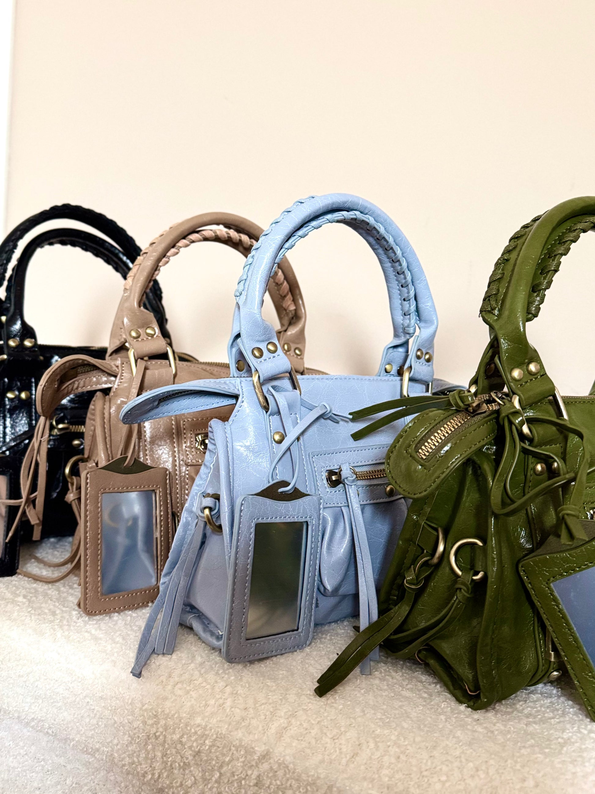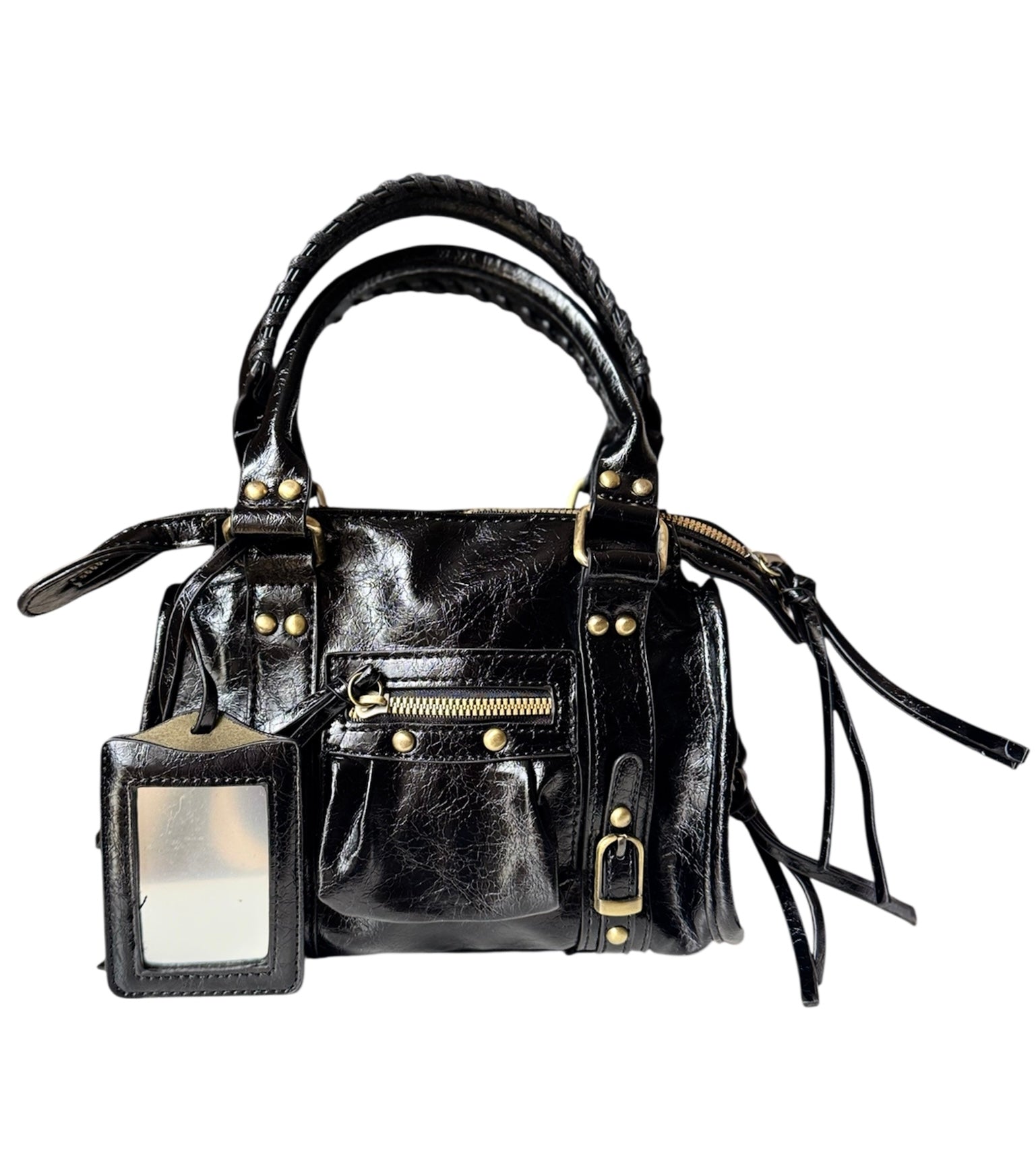 City bag in versione small con specchietto in ecopelle lucida con tracolla interna.